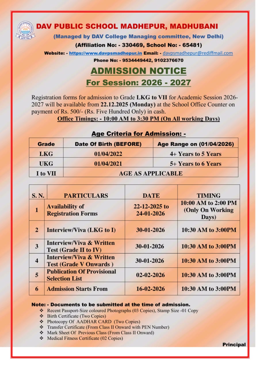 Registration Form for New Admission ( 2026-27) will be available from Today in School Office ( Monday 22nd Dec) ............please grab it immediately because seats are limited.............